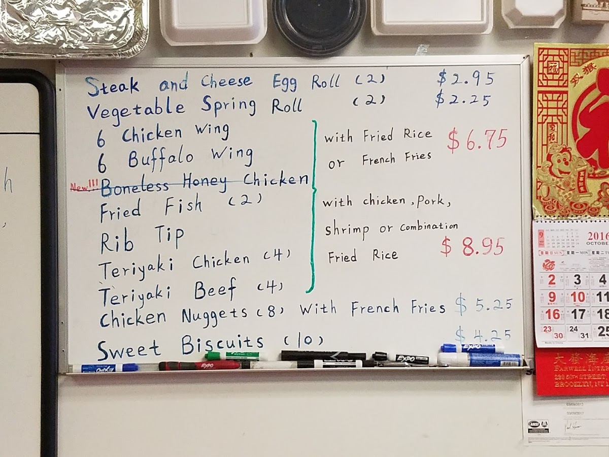 Triple Delight - combination of select meats in a sandwich. Choose from white or fried rice, or opt out. Side options include spring or egg rolls, various sodas, soups.